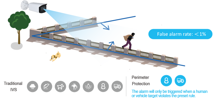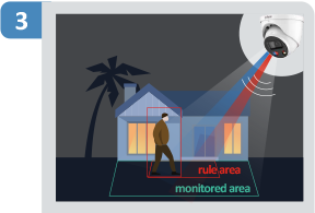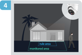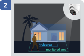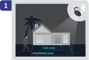 IR illuminator stays on monitoring defined areas. When activity or a target appears on those areas, warm light turns on to allow PTZ tracking. If the target enters the per-defined rule area your siren and lights turn on (Active Deterrence)